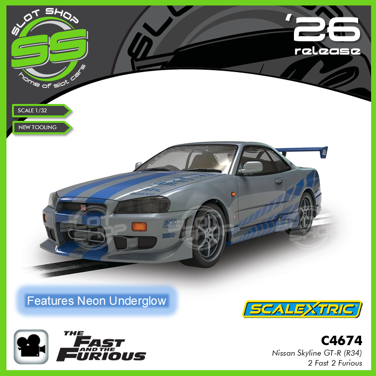 It remains one of the most iconic Skylines ever seen on screen. This Scalextric model captures that style with careful detail. The livery, stance, rear wing, and working underglow lighting effect all reflect the car seen in the film.
