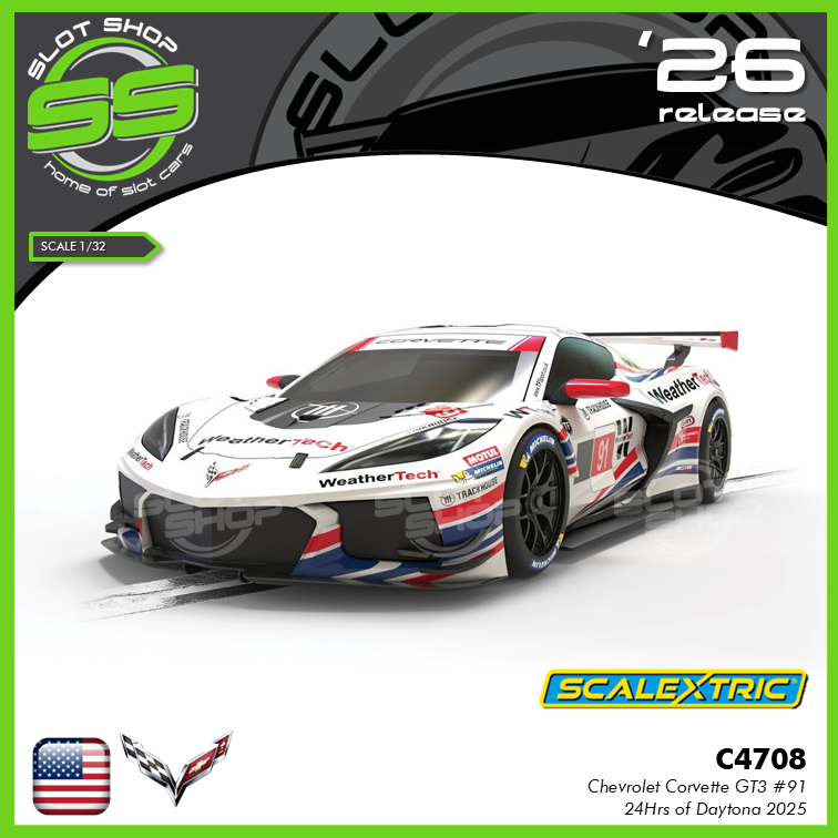 Finished in clean white with sharp GT3 details, it marked a fresh era for Corvette’s endurance programme. The real car looked tough, fast, and purposeful under the lights, and that attitude carries through into our Scalextric model.