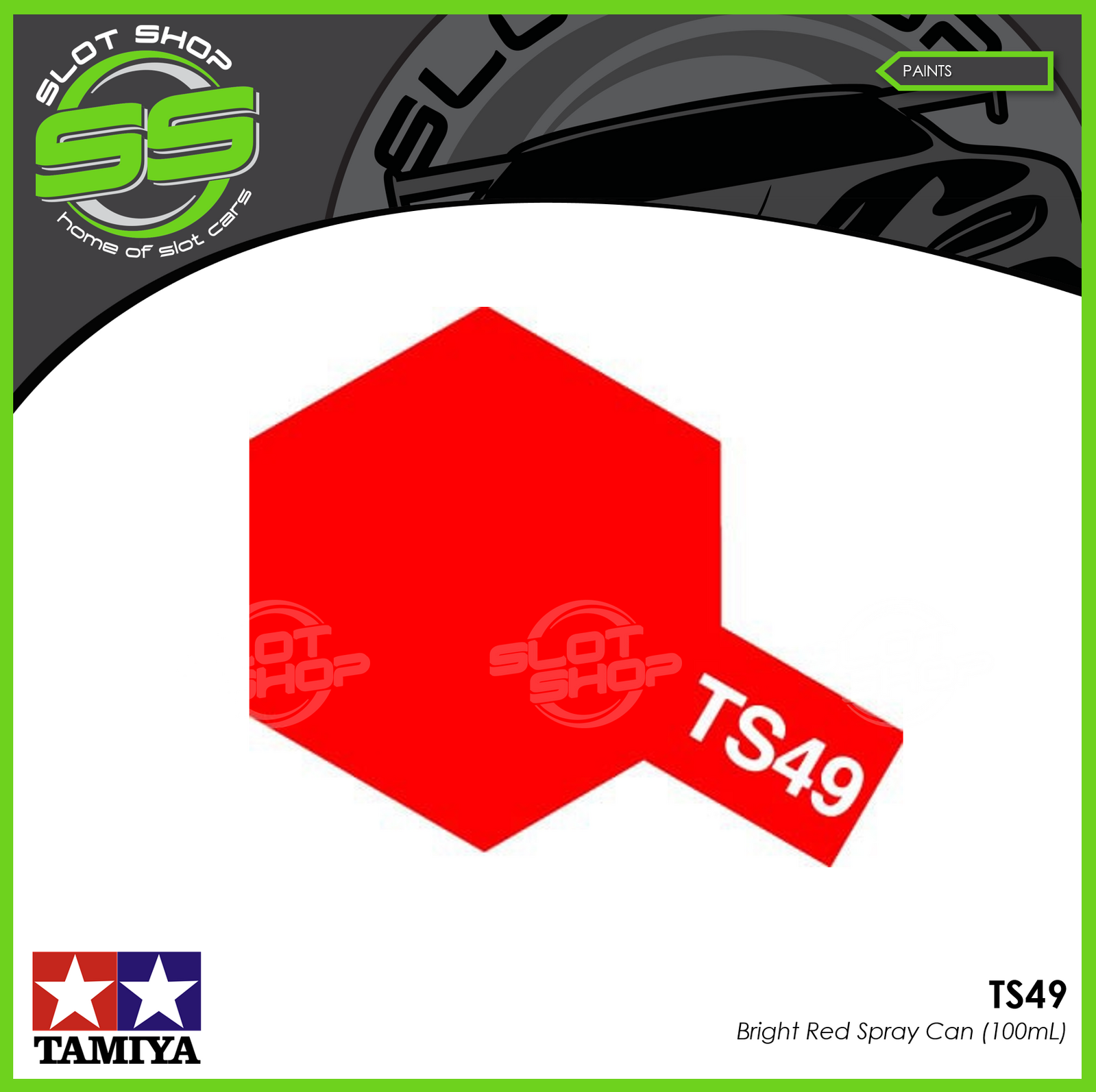 Tamiya colour range below, see a colour you want? Email us at sales@slotshop.com.au and we'll get it in for you... we've got you covered...