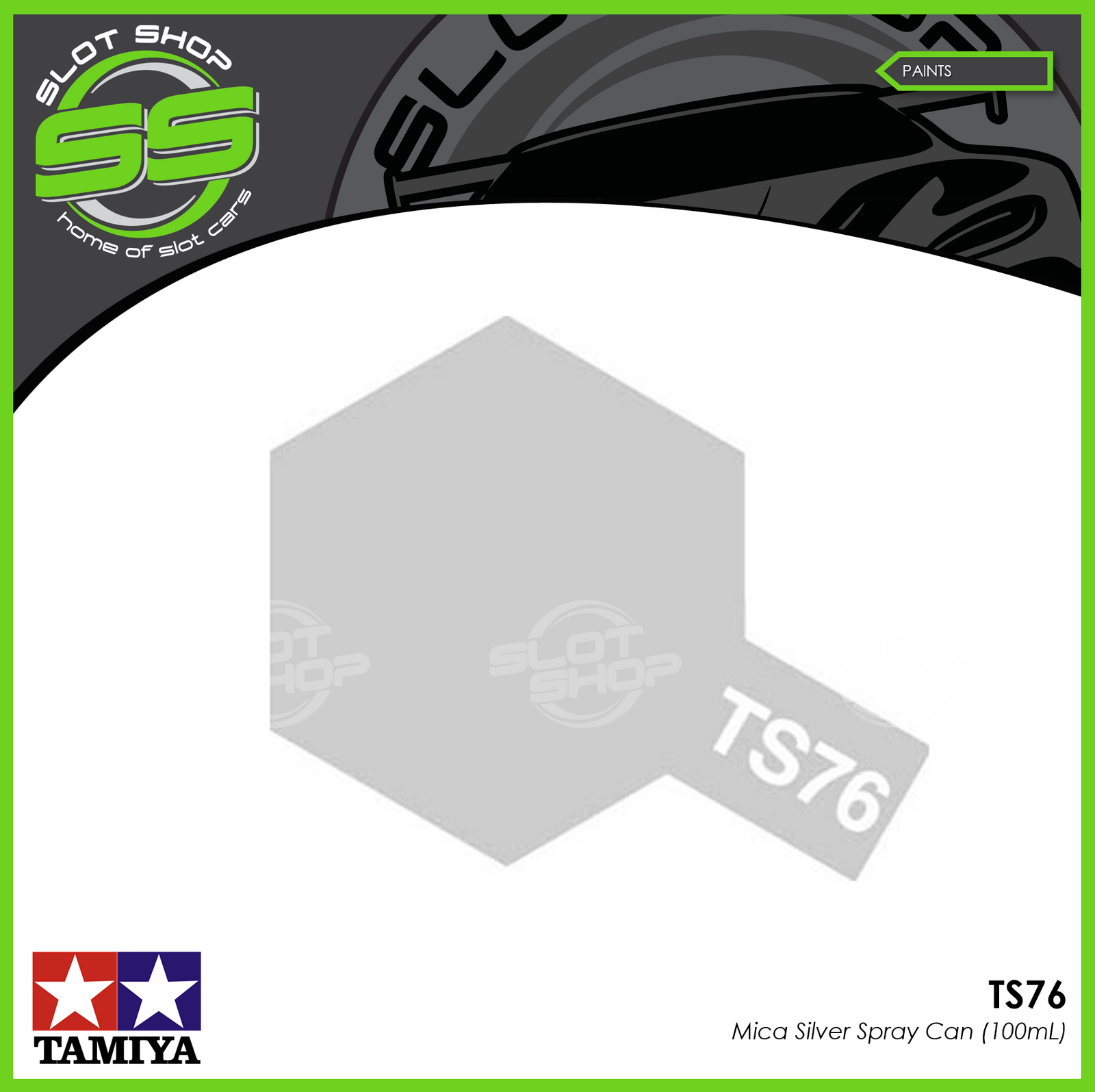 NOTE: TAMIYA TS paint is not designed to be used with clear Polycarbonate/LEXAN R/C body shells. The paint will flake off. For Polycarbonate applications please use Tamiya PS spray paint.